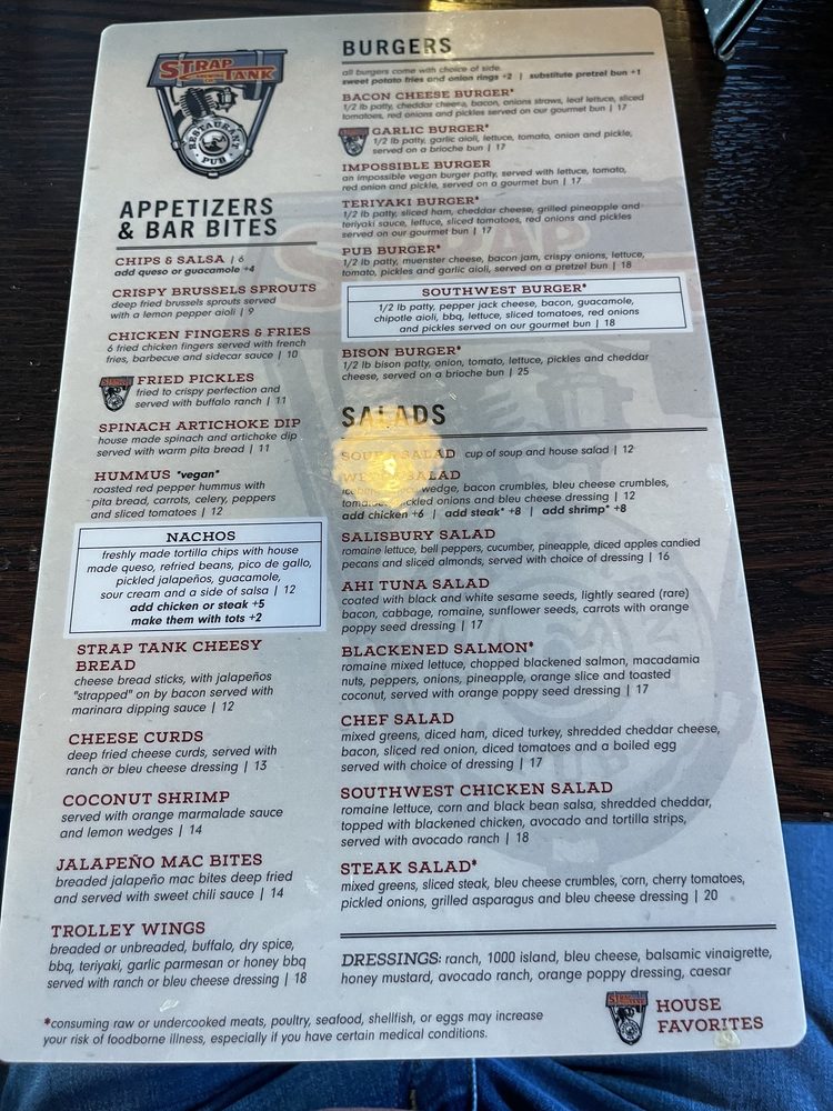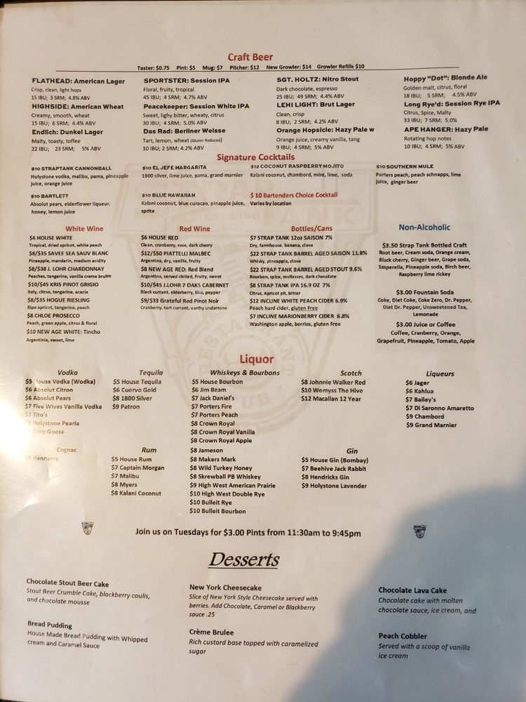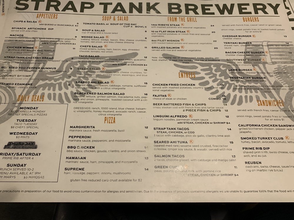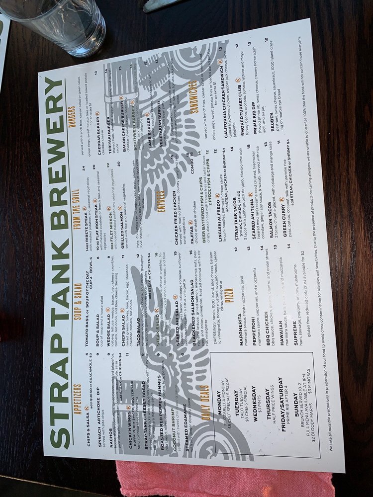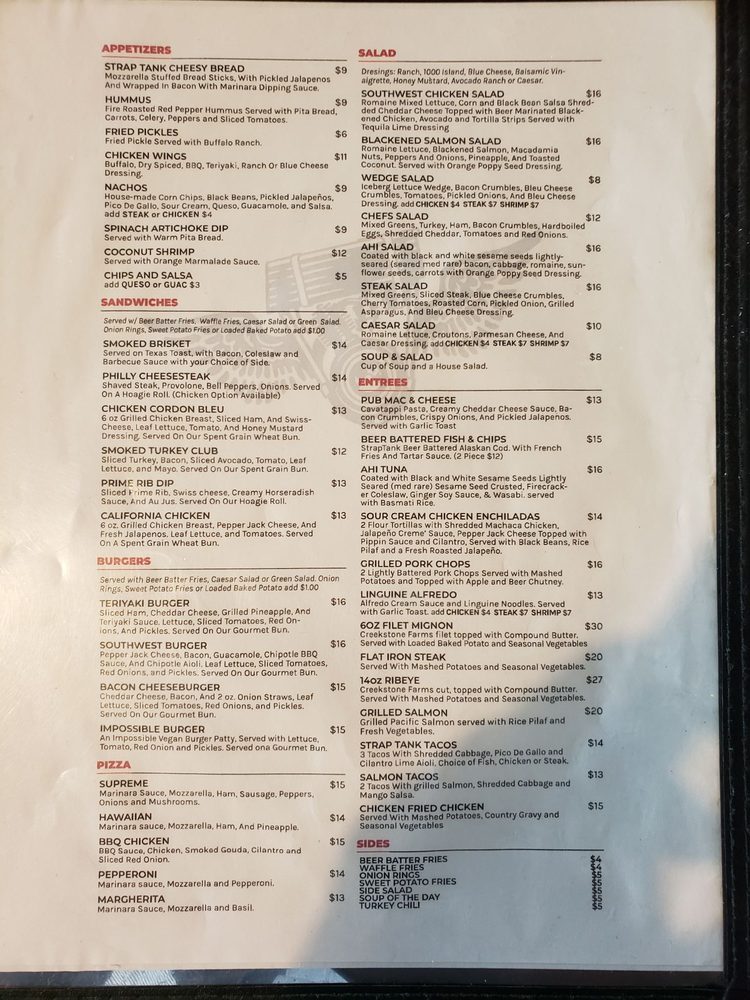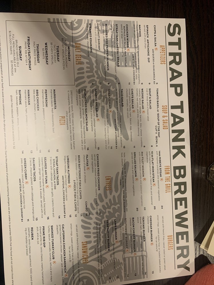 Strap Tank Brewery, located in Lehi, UT, offers a diverse menu of comfort food with a modern twist in a classy atmosphere. From their flavorful chicken wings and crispy coconut shrimp appetizers to their hearty bone-in ribeye steak entree, there is something for everyone to enjoy. Their burgers, like the bacon cheeseburger and teriyaki burger, are packed with bold flavors and fresh ingredients. The menu also includes options for vegetarians and gluten-free diners. With amenities like outdoor seating, free Wi-Fi, and a full bar, Strap Tank Brewery is a great spot for gatherings of all kinds. The brewery even offers happy hour specials and caters to dog lovers with their pet-friendly outdoor seating. Don't miss the opportunity to experience the unique dining experience at Strap Tank Brewery!